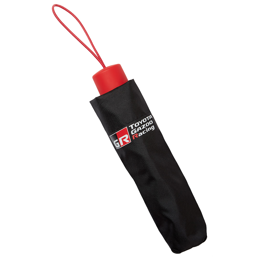 Practical and portable, the TOYOTA GR umbrella showcases the GR and TOYOTA GAZOO Racing logos, a vivid red handle, and a branded strap and sleeve for closure. When open, it spans an impressive width of approximately 90cm, offering ample coverage against the elements. Its compact size makes it the perfect addition to your vehicle, always at hand but not taking too much space.