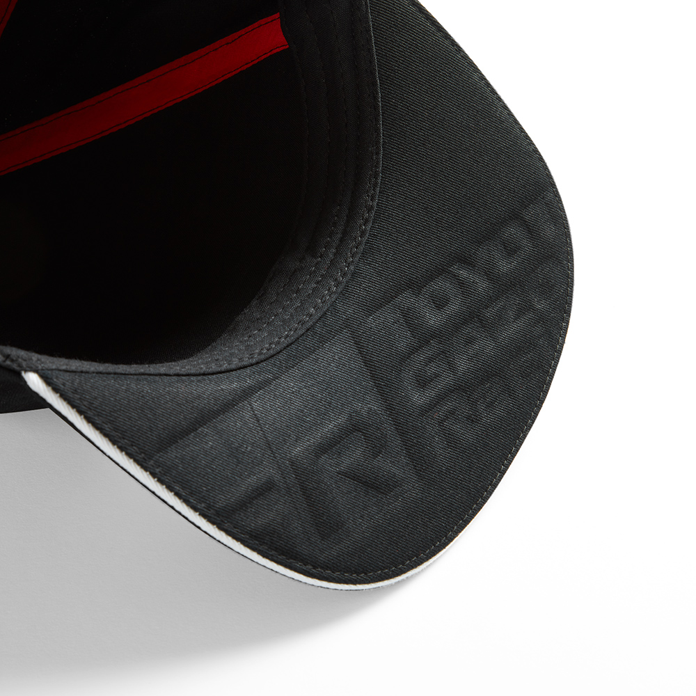 The TOYOTA GR black flat peak cap, brings a modern twist to the classic baseball cap, proudly displaying a unique, rubberised GR logo for immediate recognition. The design, featuring a structured crown, flat visor, and a subtly debossed logo on the underside of the visor. Its aesthetic appeal is amplified by the notable contrast of the white sandwich brim. Additionally, the cap is fitted with a branded Velcro closure at the back to ensure an adjustable yet comfortable fit. Perfect to enhance your look with this versatile accessory.