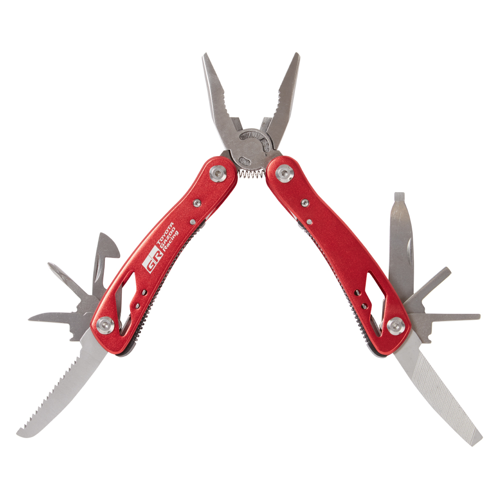 This precision-engineered TOYOTA GR multi tool with an aluminium hand grip transcends the boundaries of a mere tool, establishing itself as a multifunctional asset. A useful accessory to keep to hand and ideal for traveling, it incorporates the following:- Spring loaded pliers; Bottle / can opener; Philips screwdriver; Hole maker; Serrated edged blade