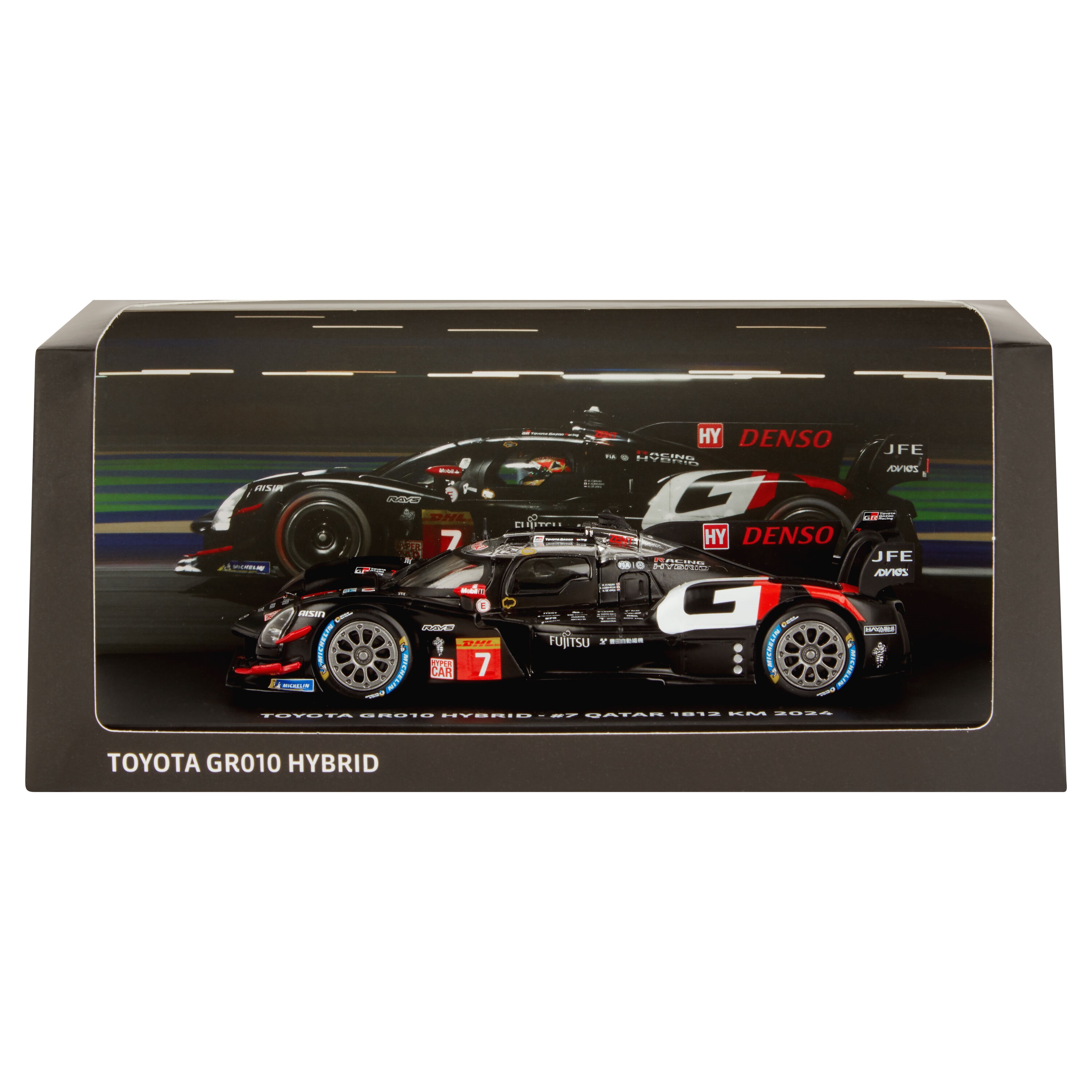 A 1-43 scale replica model of the TOYOTA GR010 HYBRID - No.7 car driven by Kamui Kobayashi, Mike Conway and Nyck de Vries at the first-ever Qatar 1812km endurance race in 2024. Individually finished and mounted with the team and 2024 sponsor logos and TOYOTA GR010 HYBRID - QATAR 1812km 2024 printed, all presented in a branded box. A true collector's model which includes all the finer details of the TOYOTA GR010 HYBRID - No.7 car. Warning - not suitable for children under 14 years old.